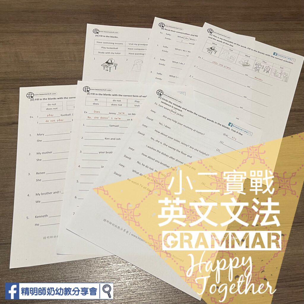 呢課會利用課外活動的詞語來繼續學Simple Present Tense, 除咗有+VE,仲有-VE同問題用法。GRAMMAR同數學都一樣,要打好個底! 小朋友加油。。。 ✅ Vocabulary (after-school activities)✅ Week of the day ✅ Grammar in use – Simple Present Tense