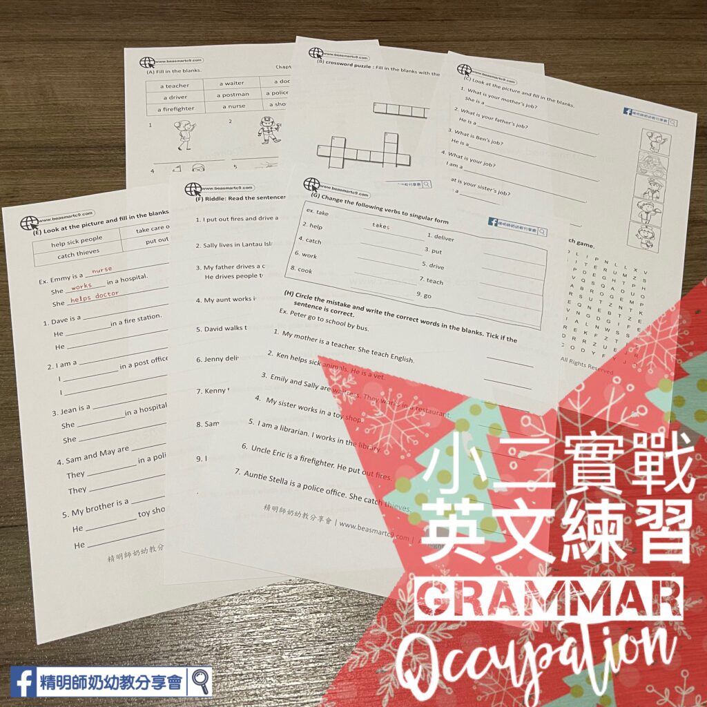 來到上學期最後一課,學職業同關於佢地既工作!係Grammar方面,主要學verbs in Singular form! 另外仲有幾個遊戲包括crossword puzzles,word search同Riddle,希望小朋友快啲記得晒啲生字😅✅ Vocabulary (occupation and their job)✅ Grammar in use           1️⃣ Question Words – What