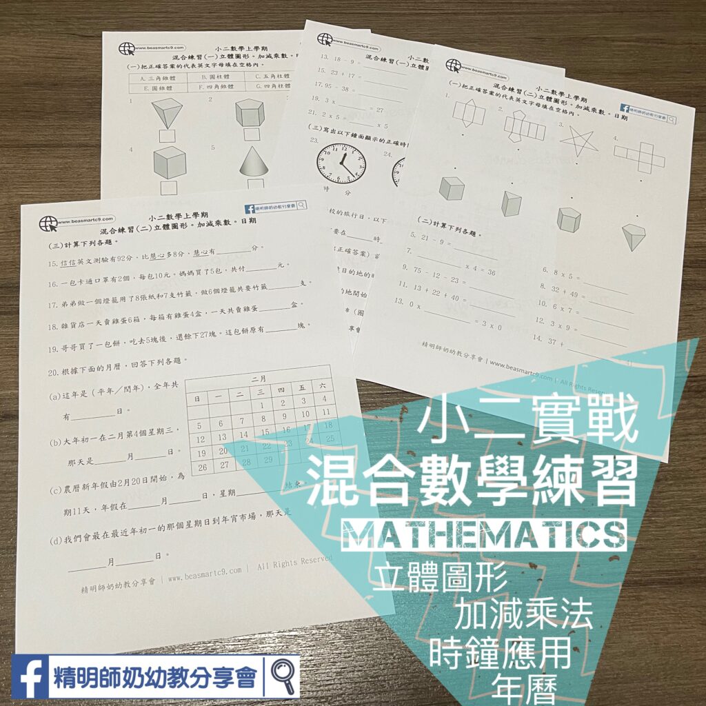 我比較鐘意做一啲混合雜錦練習,一次過cover幾個topics。咩都有少少,唔洗單一練習,無咁悶之餘又可以一次過温習幾課!今次有兩個練習,每個20+題,Set咗15分鐘,結果少過15分鐘就可以完成啦!練習內容包括: ✅立體圖形✅加減乘數(直式/橫式)✅時鐘✅日期/年曆