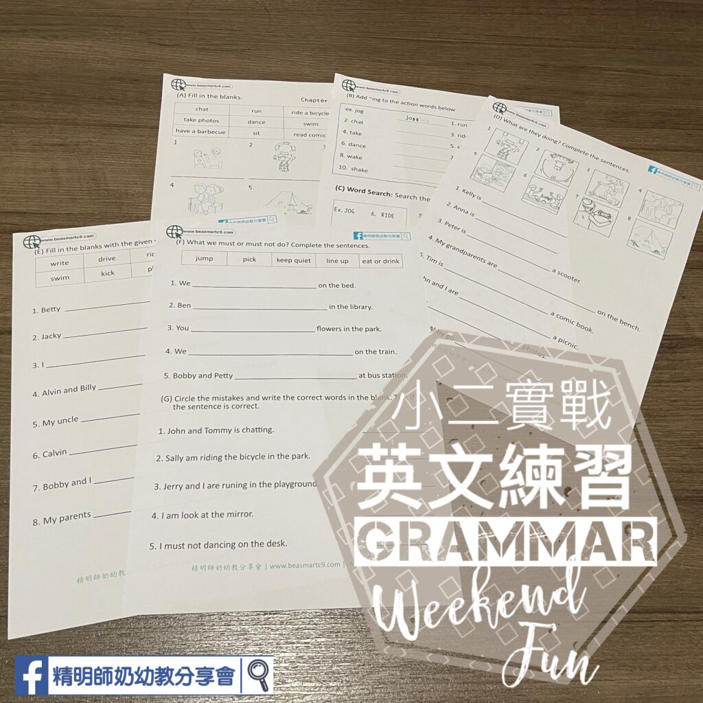 上年都已經學咗一啲Action verbs,來到小二啦,會學更多🤣特別係一啲係ing form上有變化的動詞!比如要repeat最後一個字的(swim)或要拿走個”e”字的(ride)!今次的練習包括:✅ Vocabulary (Action Verbs)✅ Verb+ing (remove ‘e’, repeat last letter)✅ Grammar in use 1️⃣ is/are + ~ing 2️⃣ must/ must not✅ abbreviation (mustn’t)✅ Cross word