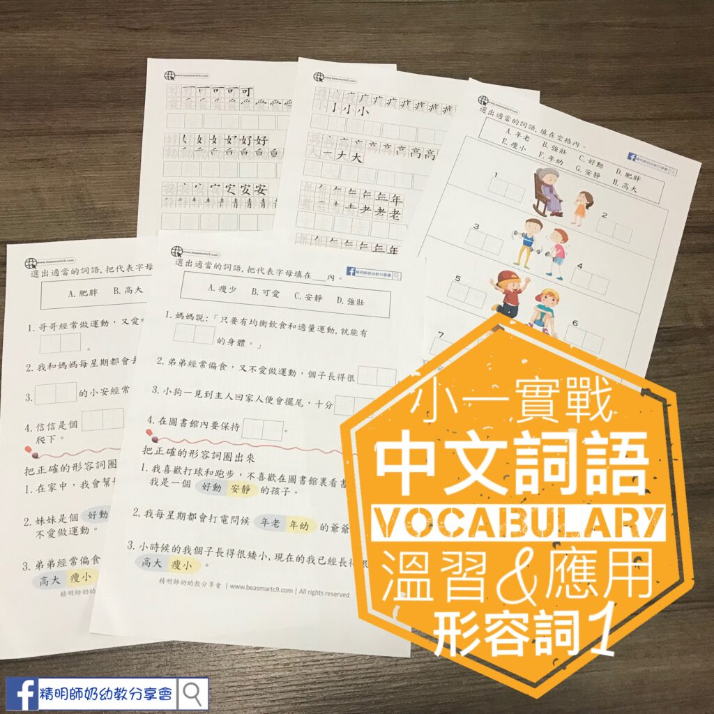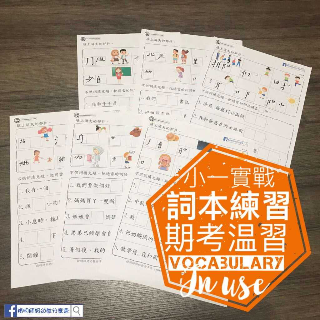 為期中中文考試做預備!詞本練習主要溫習重點中文詞語!認得個字都唔夠,仲要識得寫😅 為咗增加記生字的樂趣,工作紙的設計首唔洗小朋友寫晒成個字,先請小朋友填上消失的部件!以遊戲學習增加記憶🤪好快就可以默到個字出來! 工作紙包括以下32個中文生字! 🎟 書包, 同學, 學校, 老師, 陽光, 身子, 鞋子, 孩子, 爺爺, 月亮, 月餅, 爸爸, 跳, 叫, 笑, 穿, 幫, 吃, 玩, 看, 排隊, 伸手, 早操, 彎腰, 吵鬧, 回家, 背着, 歡笑, 温暖,