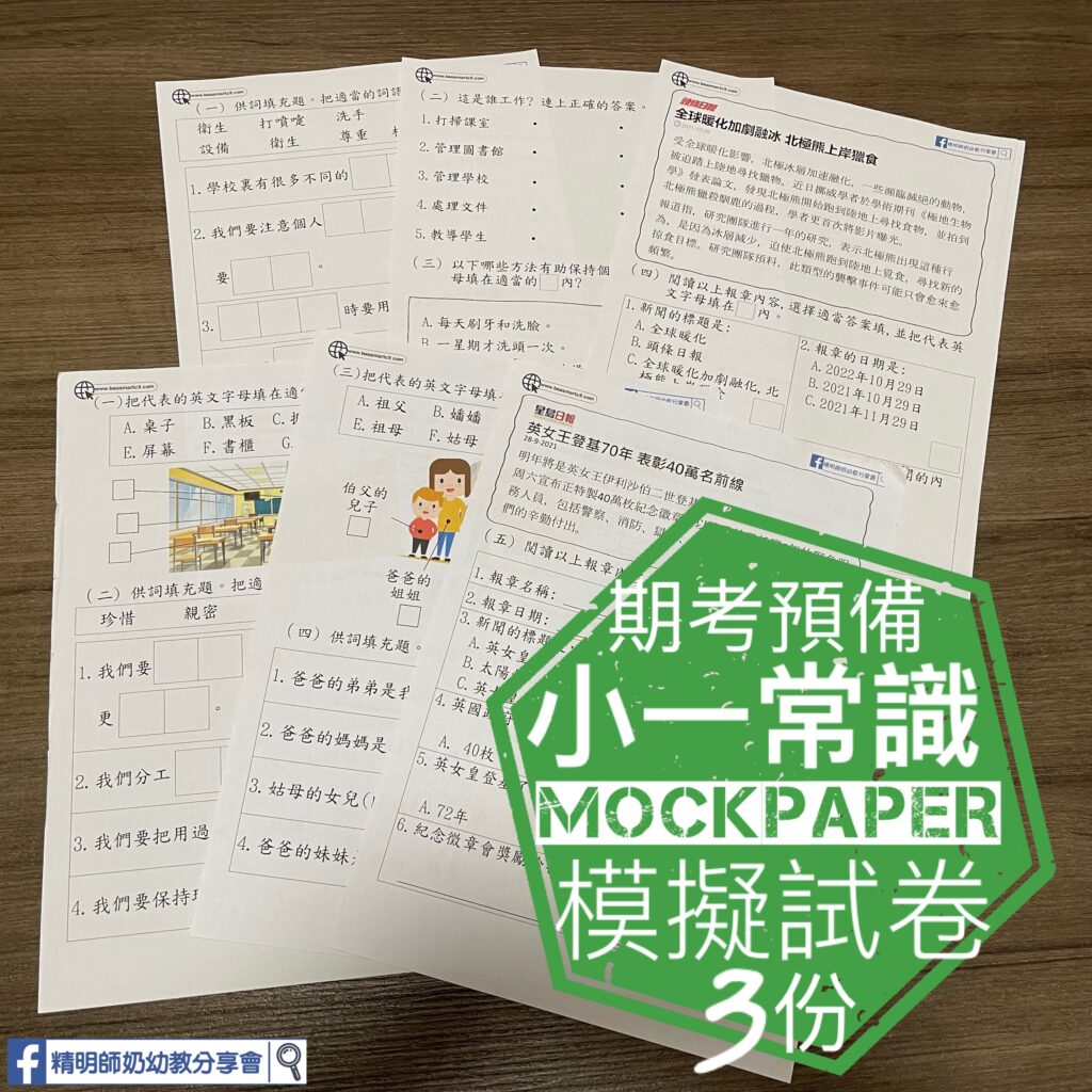 常識考咩呢?我覺得主要係考中文生字同閲讀理解,加上一啲common sense😅要溫又唔知從何入手,個範圍好似好大,咩都要識啲咁😀簡單做咗3份模擬試卷,當比小朋溫習下啲生字,仲有啲剪報練習,簡單考下理解題目!內容包括: ✅ 我的學校 (人物,設備)✅ 健康校園(個人衞生,健康飲食)✅ 我的家人 (關係,活動)✅ 剪報閲讀(認識報章版,標題,名稱,日期,內容等)