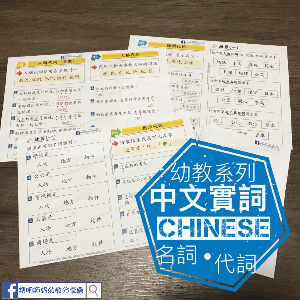 中文字真係好豐富!如果要細分詞類,可以有十幾種咁多!由最簡單嗰兩項入手先😅名詞同代詞!我問呀仔咩係名詞呀?佢答我「摸得到嗰啲囉」🤣雖然唔啱得晒,不過都唔可以話佢錯既!同樣代詞都有好多種,人物、時間、疑問….教學主要為小一備戰,所以唔會去鑽研太深!只希望小朋友明白基本,打好中文底子👍🏼 學習內容包括: ✅ 名詞(人物、動物、植物、地方、交通工具、物件)✅ 人稱代詞(你、我、他)✅ 人稱代詞 – 多數(你們、我們、他們)✅ 指示代詞(這、那)✅ 疑問代詞(誰、哪、甚麼、怎樣) 教學書仔雙面設計,每個主題後配有延申小練習!雙面印刷,由短頁翻!另外附上6頁對應練習👍🏼