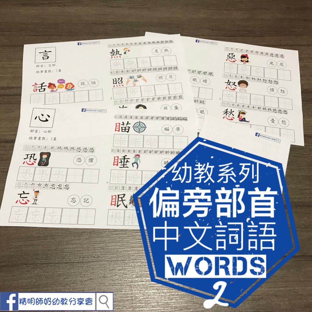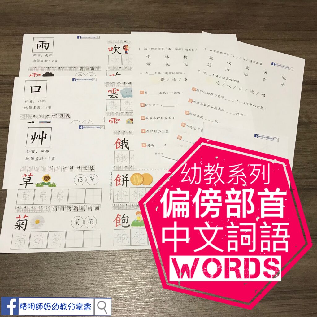 「偏傍」同「部首」其實係唔同! 之前用拆字練習來學習偏傍! 把合體字的結構部件拆出來!比如「話」字,由「言」字和「舌」字兩個偏傍組成! 來到K3可以開始學部首啦!部首字係形聲字的形旁,如「林, 樹, 村, 枝, 根」大家都係「木」字部! 教小朋友部首時,可以看成係一個首領,帶住一對對員! 第一波書仔有9個部首,包括「木, 力, 口, 雨, 艸, 食, 土, 水, 米」部首以紅色顯示! 每個部首有5個字及配詞! 配合筆順可以練習寫字!
