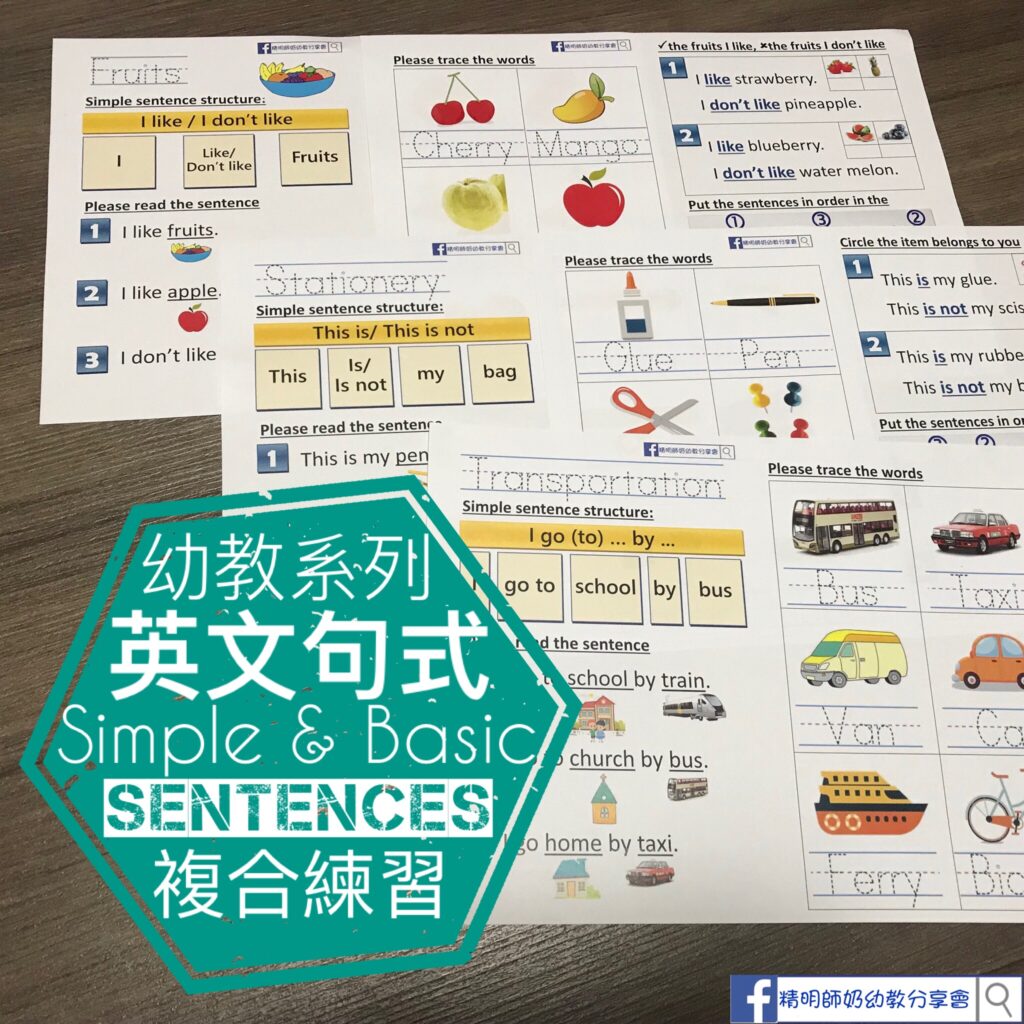 今次做咗呢個簡單的英文句式複合練習!主要用5個主題去教下面5種句式!仲有12個主題生字可以比小朋友做trace the word. 配合1-2組簡單練習🤘🏻練習一:簡單的閱讀理解,練習二:從組句子🤗每款4頁(B5 size) ✅I like/ I don’t like (Fruits)✅This is/ This is not (Stationery) ✅I go to … by …