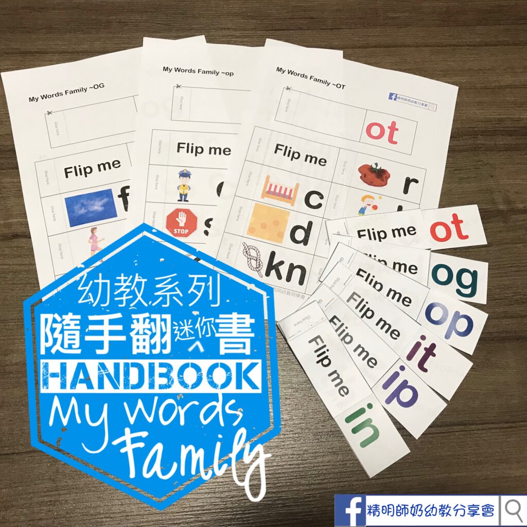 呢個簡單的隨手翻迷你書用來教My Words Family係最適合🙈把rhymes到的字放埋一齊學可以提升效率,學串字仲快好多呀!之前學的All系列,一轉眼就已經可以學識串晒8個生字啦!第二炮 – OP OG OT IP IT IN 製作方法:1)大小長方形剪出2)沿虛線對摺一下3)大長方形放最底,flip me 放最面,其他小長方形逐張貼在Glue Here!(懶人方法,㩹齊後一次過釘好)My Words Family- 隨手翻迷你書