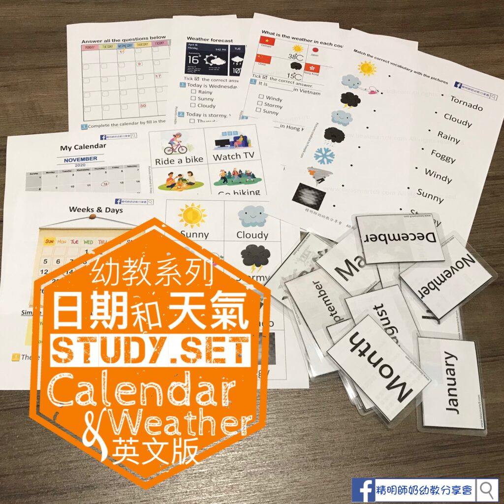 停課到而家,中文Study Set已經做咗3 sets,今次試下做個英文版先 🤗教小朋友學生字,我比較喜歡帶一個主題,一來生字上會有連繫,小朋友可以一次過學習相關詞語😅在記憶方面大有益處!再配合適當的練習,可以加強記憶…做重造句子時會更得心應手🤭 諗咗好耐用咩做主題,最後決定用日期和天氣☔️🌬🌨⛈☀️ 英文生字Flashcard一樣無圖畫,不過有中文生字對照!停課不停學,小朋友加油💪🏼 ✅ B5書仔一本 – 下載✅ 52個英文生字Flashcard (中英對照,無圖畫) – 下載✅ 天氣練習 x 3 – 下載✅ Calendar練習 x 2 – 下載  💕書仔已經排好版,要底面印,從短邊翻頁🤘🏻