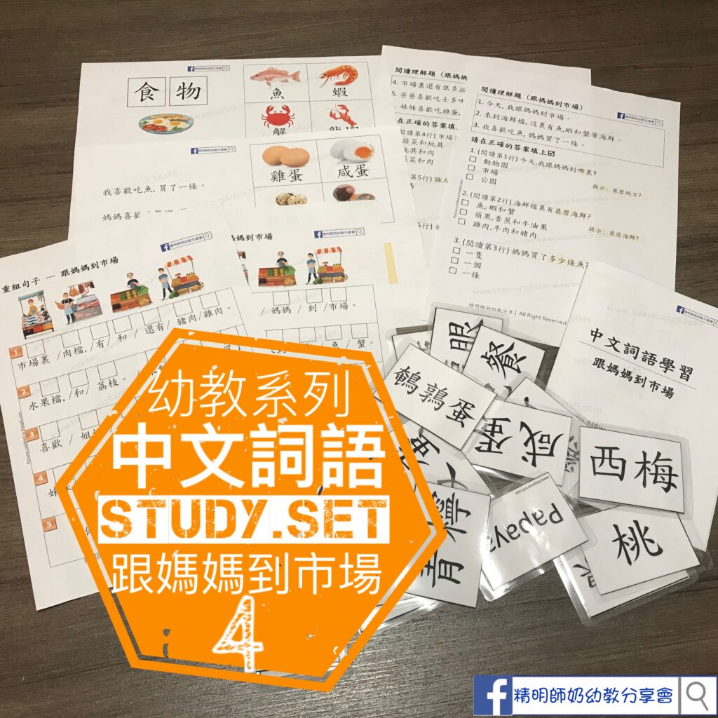 第四個單元中文詞語「跟媽媽到市場」來啦!今次想帶小朋友到市場,認識一下市場上會見到的東西!來到市場,會見到海鮮,蔬菜,生果,肉類,雞蛋…簡單的生果詞語已經學識咗,今次教啲新的詞語先!榴槤,熱情果, 柚子…今個單元重手咗,有70個生字…唔知要教幾耐先識晒呢? 另外加插咗啲「量詞」同簡單的中文句子!中文Flashcard都係無圖畫!得中英對照🙈今次的練習除咗有簡單的重組句子,仲有簡單的閲讀理解題! 停課不停學💪🏼💪🏼 ✅「跟媽媽到市場」書仔 ✅ 68個中文詞語+8個量詞Flashcard✅ 中文簡單閲讀理解題✅ 中文重組句子練習 x 10題